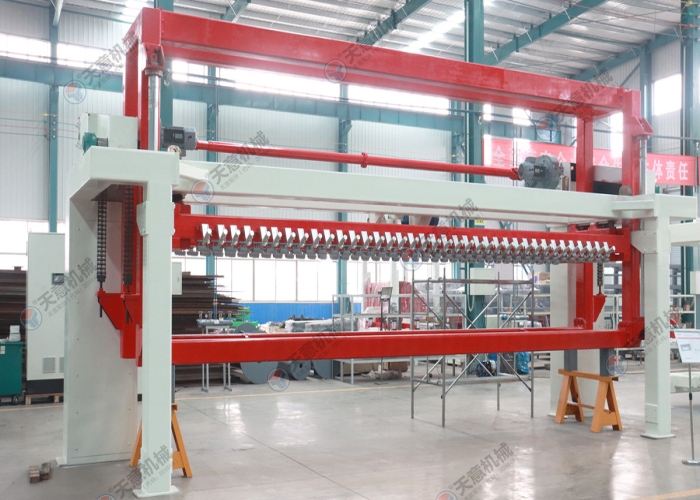 脫模后的坯體連同側(cè)板一起放置在切割小車上,切割小車由減速電機(jī)驅(qū)動(dòng)行走,通過(guò)縱向切割機(jī)完成縱向切割,切割小車?yán)^續(xù)行走至橫向 切割機(jī)中間位置停止后,由小車置換裝置將側(cè)板連同坯體抬起,切割小車退回翻轉(zhuǎn)行車底下進(jìn)行下一次承載脫模后的坯體,另外一部切割小車 進(jìn)入置換裝置底下后, 置換裝置將側(cè)板連同坯體放置該切割小車上后,橫向切割動(dòng)作后啟動(dòng)進(jìn)行橫向切割動(dòng)作,切割完成后,切割小車再行走至確地行車底下,再由 翻轉(zhuǎn)去底行車將坯體去底(連側(cè)板)吊至蒸養(yǎng)小車上,切割小車范圍原始位置進(jìn)行下一個(gè)切割循環(huán)。